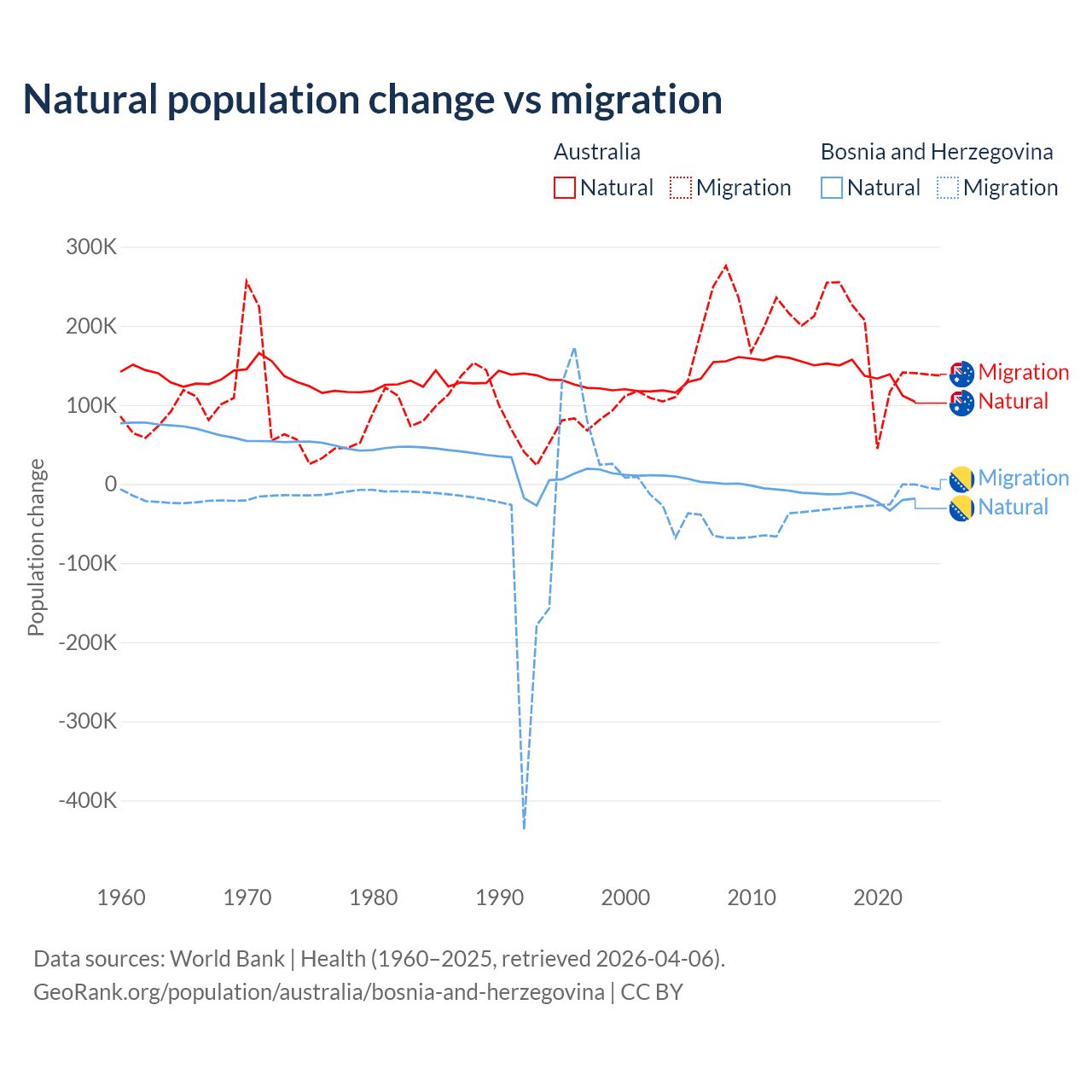 Over the last 10 years, 43.6% of the population change in Australia is from natural causes (a gain of 1,389,408 people) and 56.4% is from migration (a gain of 1,798,171 people). In Bosnia and Herzegovina 41.1% is from natural causes (a loss of 169,384 people) and 58.9% is from migration (a loss of 243,117 people).