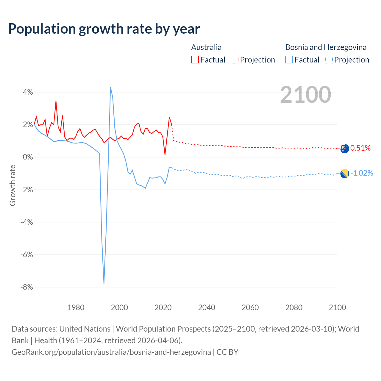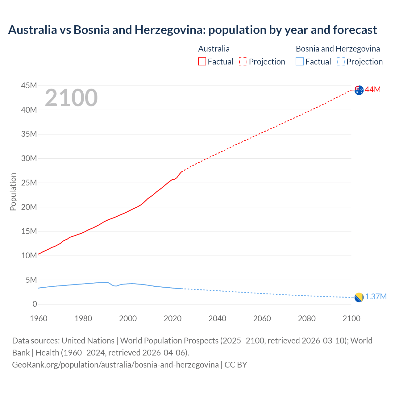 Australia vs Bosnia and Herzegovina: population by year and forecast