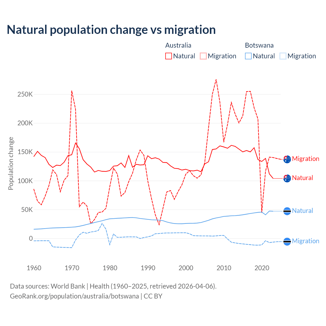 Over the last 10 years, 43.6% of the population change in Australia is from natural causes (a gain of 1,389,408 people) and 56.4% is from migration (a gain of 1,798,171 people). In Botswana 82.5% is from natural causes (a gain of 436,373 people) and 17.5% is from migration (a loss of 92,293 people).