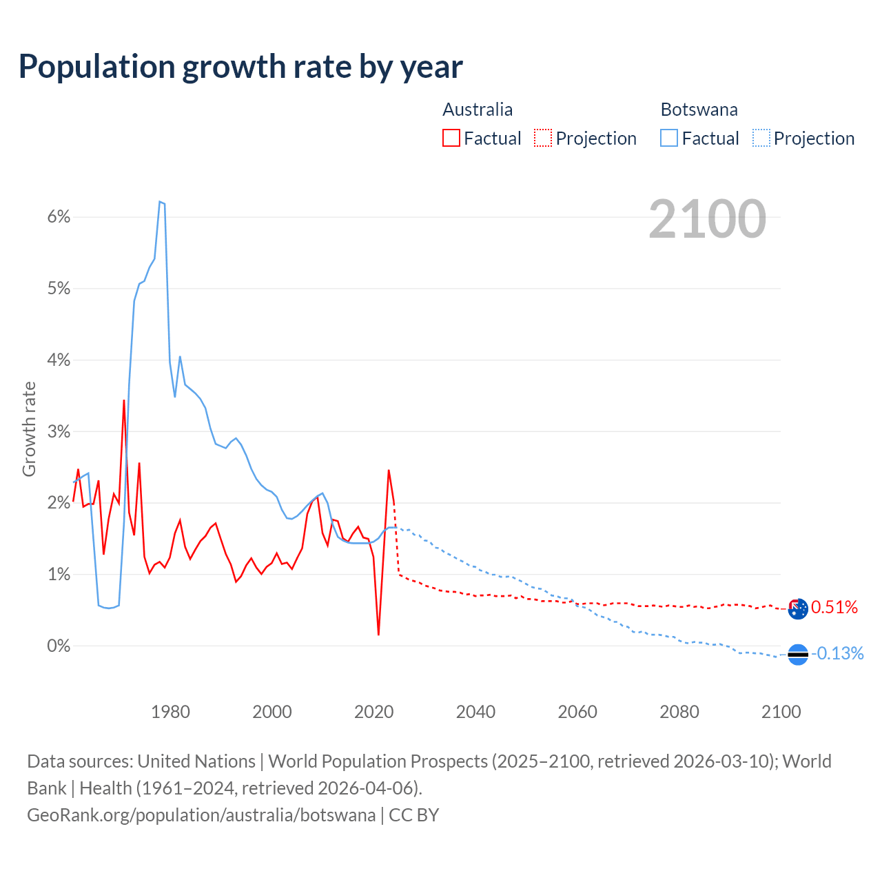 Australia vs Botswana: population by year and forecast