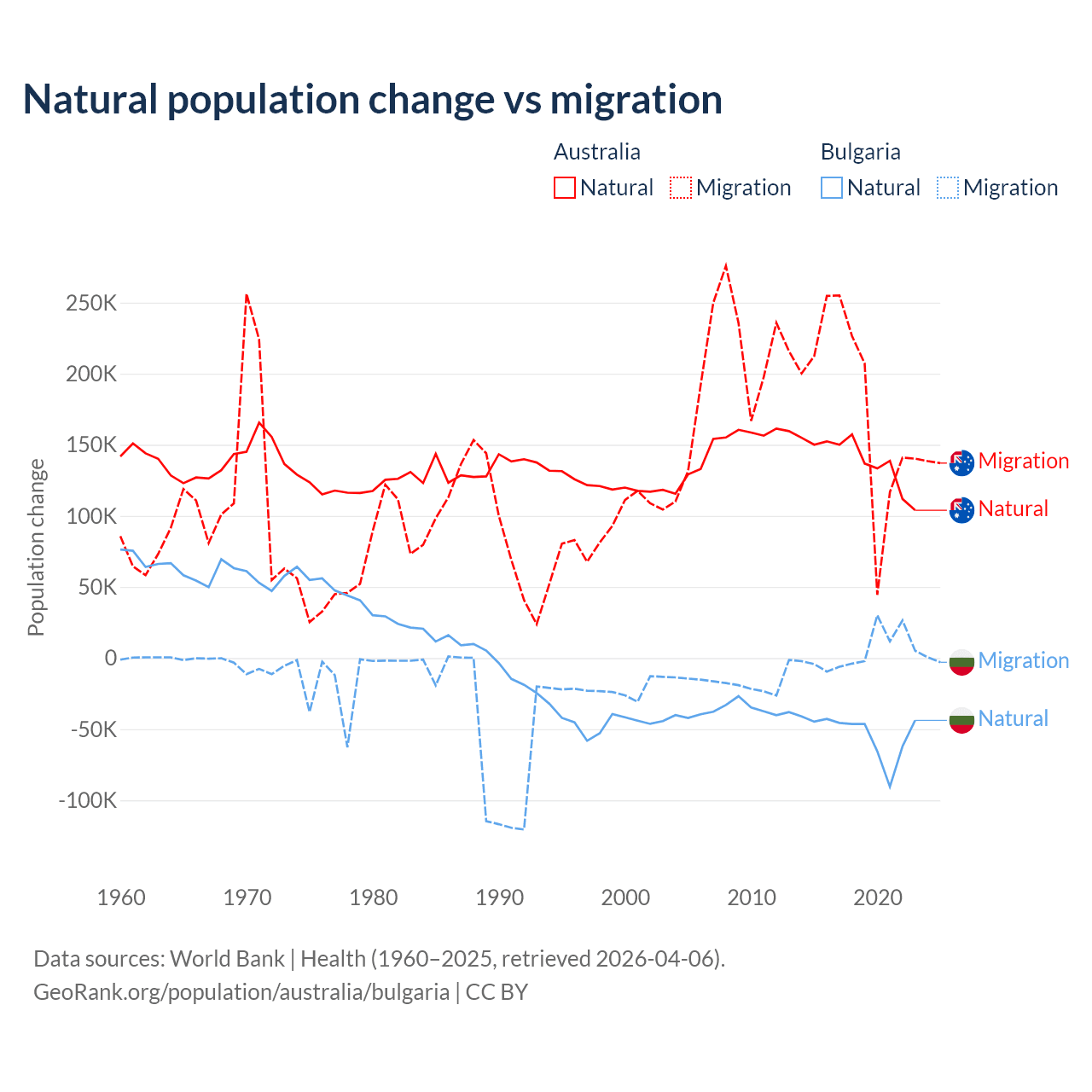 Over the last 10 years, 43.6% of the population change in Australia is from natural causes (a gain of 1,389,408 people) and 56.4% is from migration (a gain of 1,798,171 people). In Bulgaria 92.1% is from natural causes (a loss of 528,535 people) and 7.94% is from migration (a gain of 45,567 people).