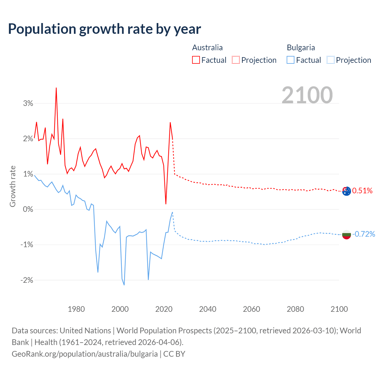 - For the last 10 years, Australia has had an average growth rate of +1.49% per year vs -0.96% in Bulgaria.