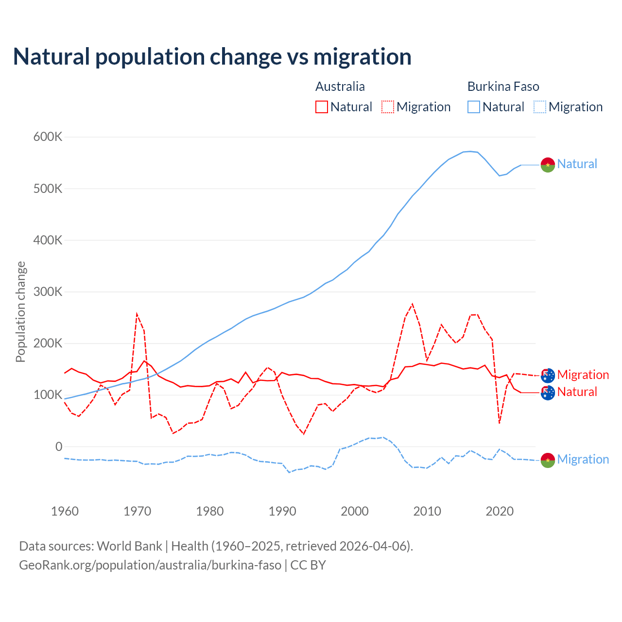Over the last 10 years, 43.6% of the population change in Australia is from natural causes (a gain of 1,389,408 people) and 56.4% is from migration (a gain of 1,798,171 people). In Burkina Faso 96.9% is from natural causes (a gain of 5,506,960 people) and 3.13% is from migration (a loss of 177,923 people).