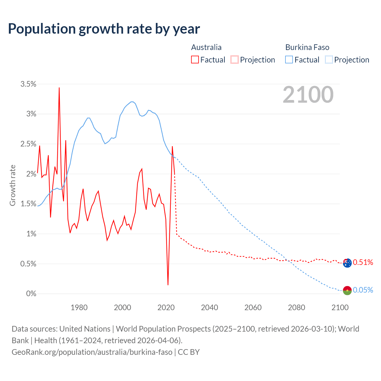 Australia vs Burkina Faso: population by year and forecast