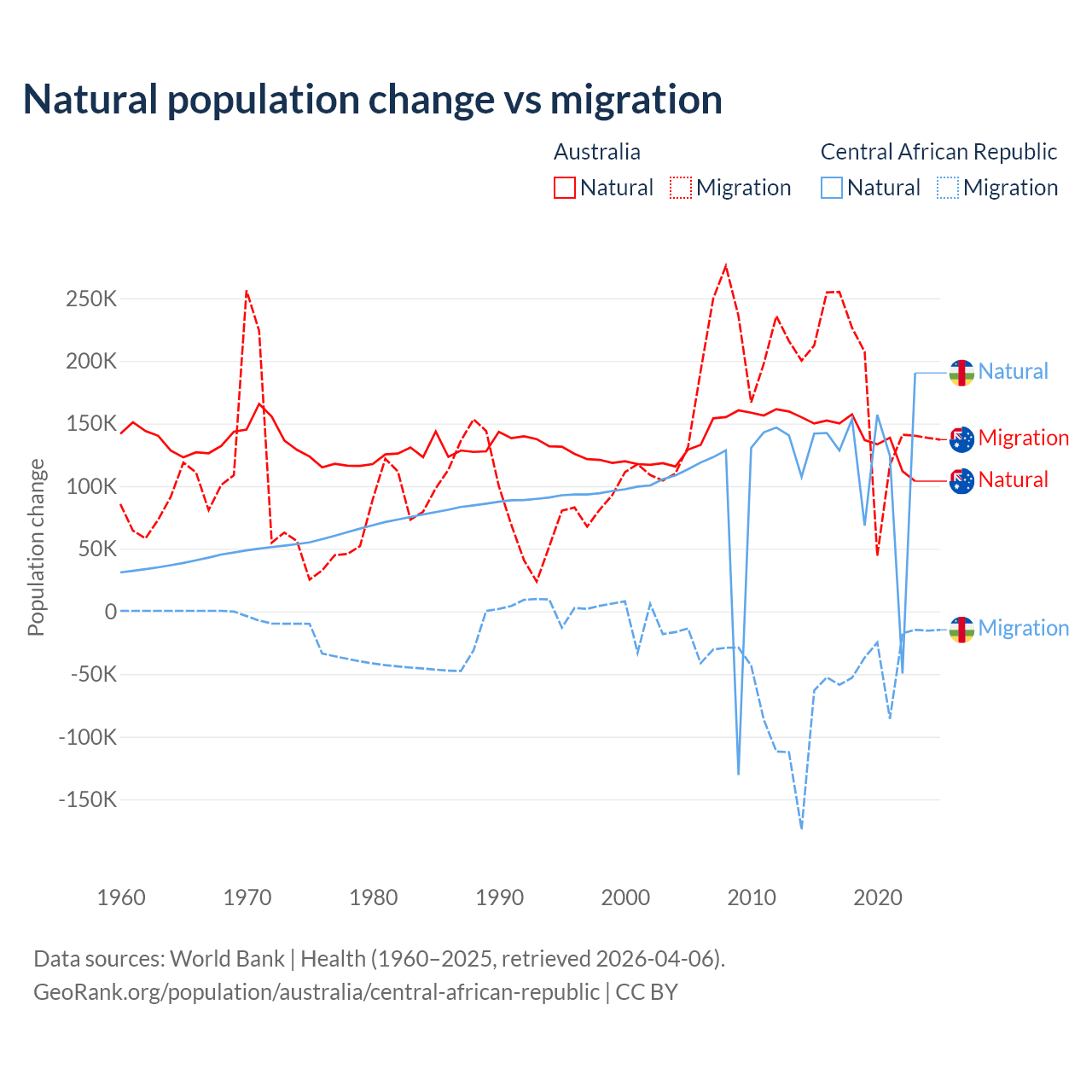 Over the last 10 years, 43.6% of the population change in Australia is from natural causes (a gain of 1,389,408 people) and 56.4% is from migration (a gain of 1,798,171 people). In the Central African Republic 66.7% is from natural causes (a gain of 1,164,312 people) and 33.3% is from migration (a loss of 580,593 people).