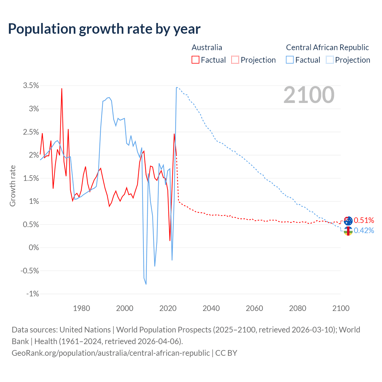 - For the last 10 years, Australia has had an average growth rate of +1.49% per year vs +1.27% in the Central African Republic.