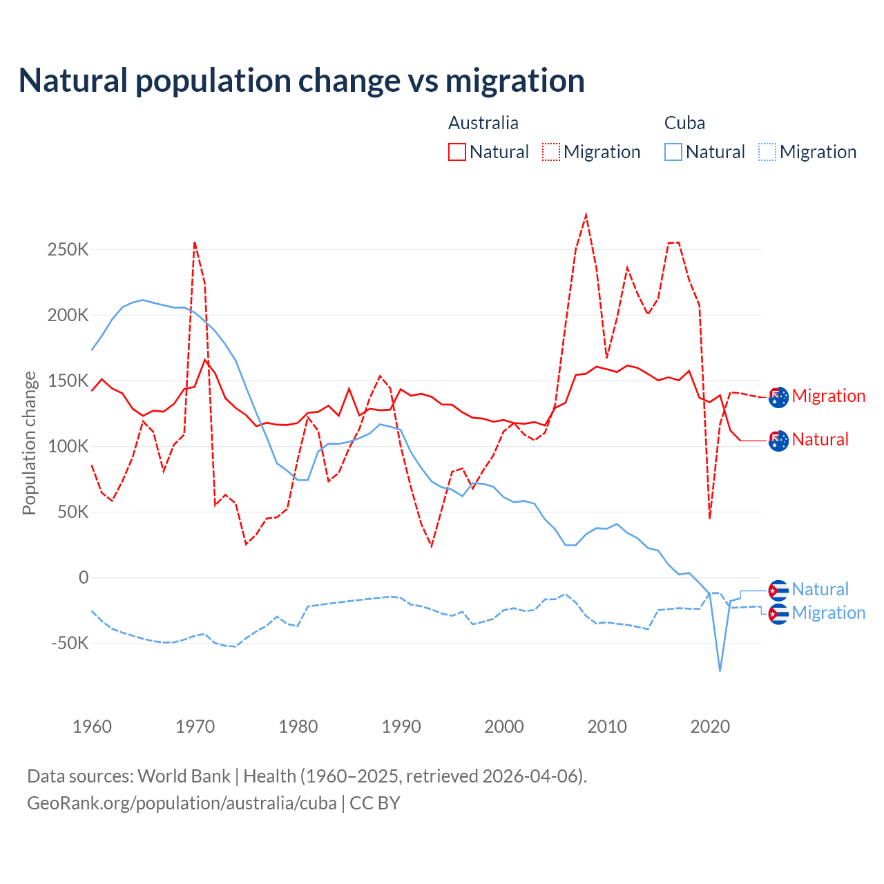 Over the last 10 years, 43.6% of the population change in Australia is from natural causes (a gain of 1,389,408 people) and 56.4% is from migration (a gain of 1,798,171 people). In Cuba 21.9% is from natural causes (a loss of 64,179 people) and 78.1% is from migration (a loss of 229,508 people).