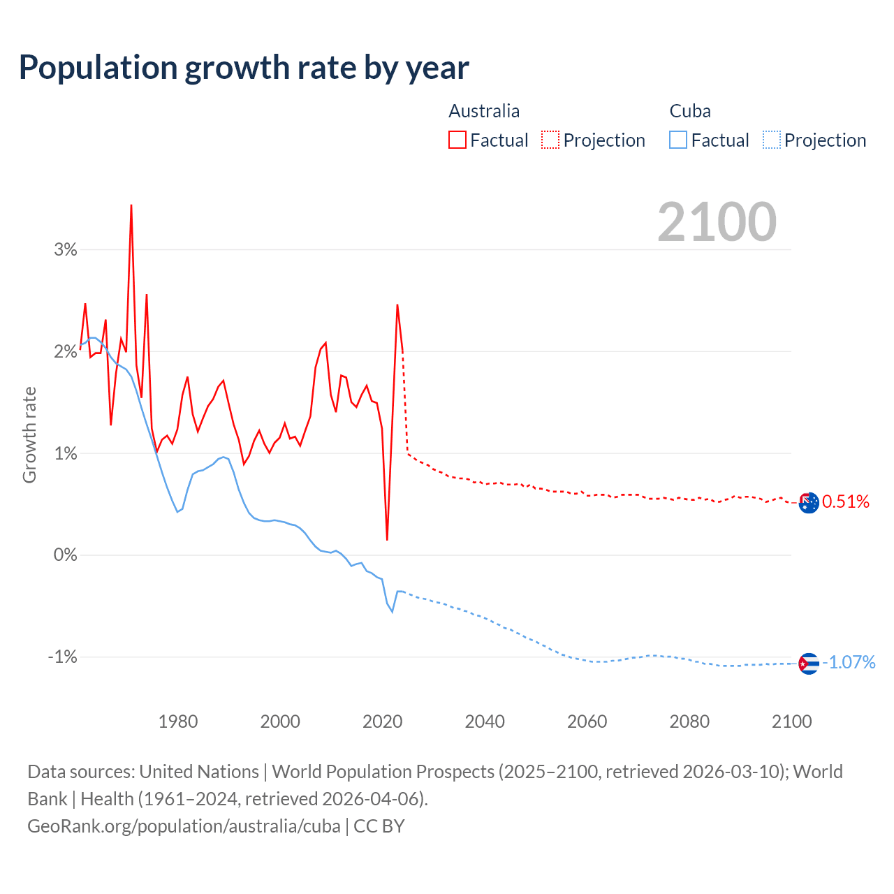 - For the last 10 years, Australia has had an average growth rate of +1.49% per year vs -0.26% in Cuba.