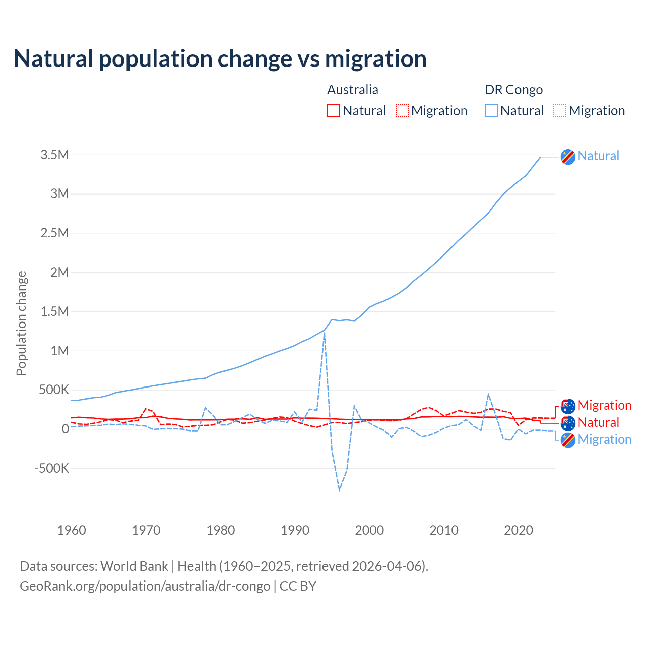 Over the last 10 years, 43.6% of the population change in Australia is from natural causes (a gain of 1,389,408 people) and 56.4% is from migration (a gain of 1,798,171 people). In the DR Congo 99.1% is from natural causes (a gain of 30,150,516 people) and 0.89% is from migration (a gain of 270,872 people).