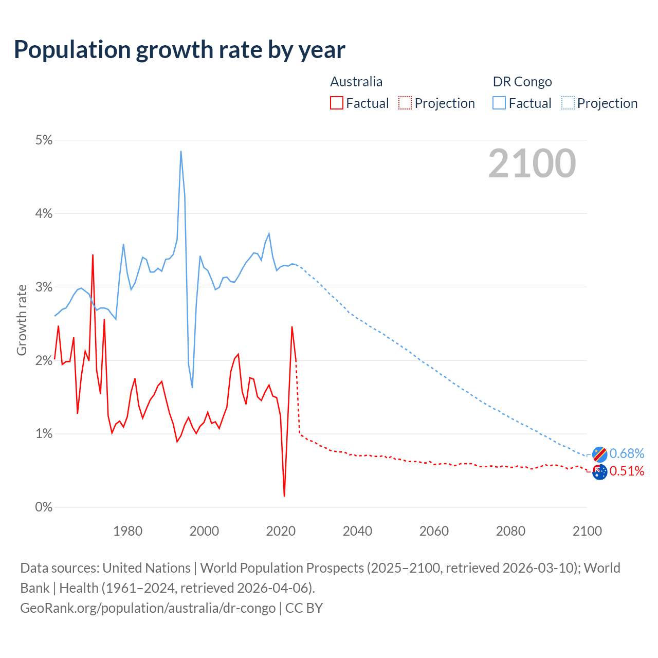 - For the last 10 years, Australia has had an average growth rate of +1.49% per year vs +3.38% in the DR Congo.