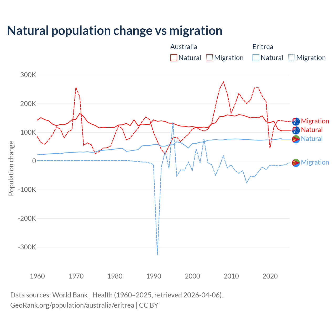 Over the last 10 years, 43.6% of the population change in Australia is from natural causes (a gain of 1,389,408 people) and 56.4% is from migration (a gain of 1,798,171 people). In Eritrea 68.8% is from natural causes (a gain of 742,837 people) and 31.2% is from migration (a loss of 336,243 people).