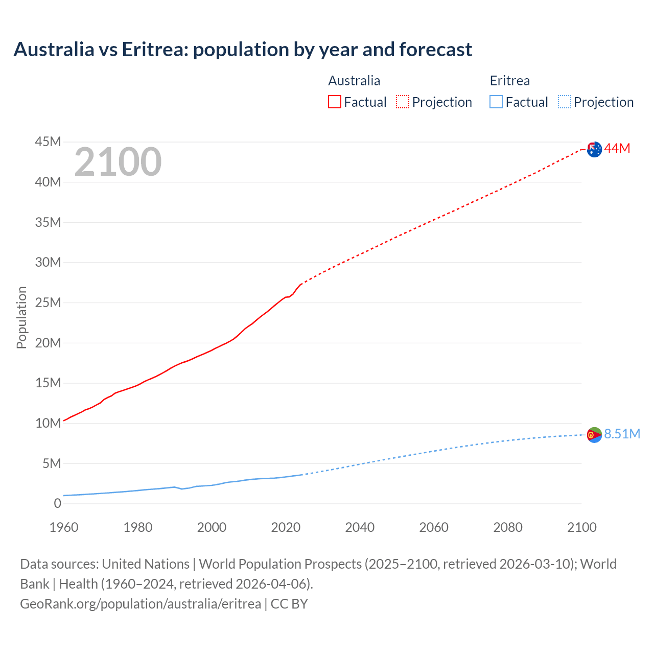 Australia vs Eritrea: population by year and forecast