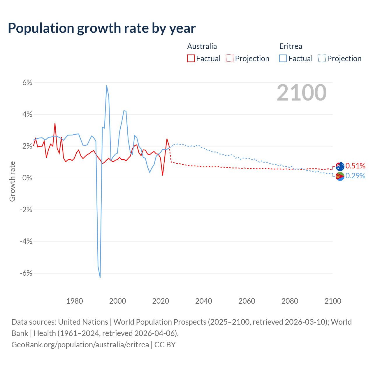 - For the last 10 years, Australia has had an average growth rate of +1.49% per year vs +1.28% in Eritrea.