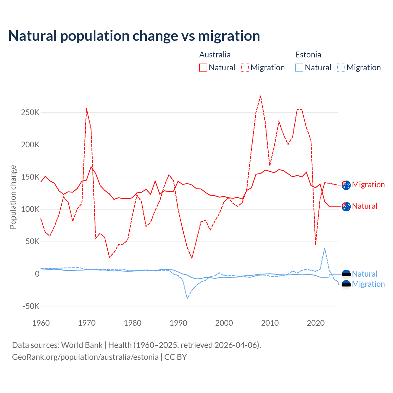 Over the last 10 years, 43.6% of the population change in Australia is from natural causes (a gain of 1,389,408 people) and 56.4% is from migration (a gain of 1,798,171 people). In Estonia 26.1% is from natural causes (a loss of 27,683 people) and 73.9% is from migration (a gain of 78,553 people).