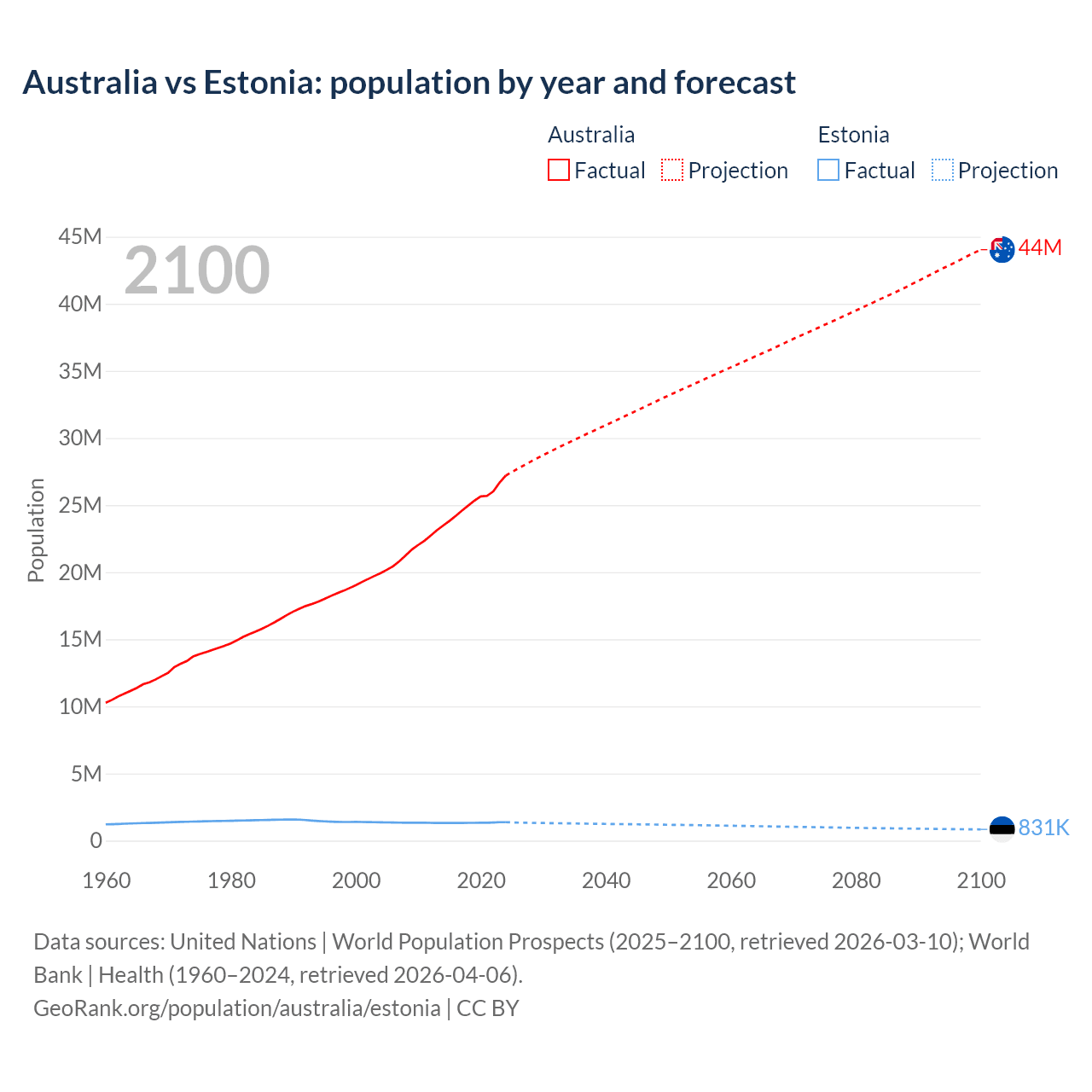 The latest officially reported population of Australia was 27,196,812 in 2024 vs 1,372,341 people in Estonia in 2024. In 2026, based on the adjusted UN estimation, the current Australia's population is 27,799,169 people compared to 1,339,590 in Estonia.
