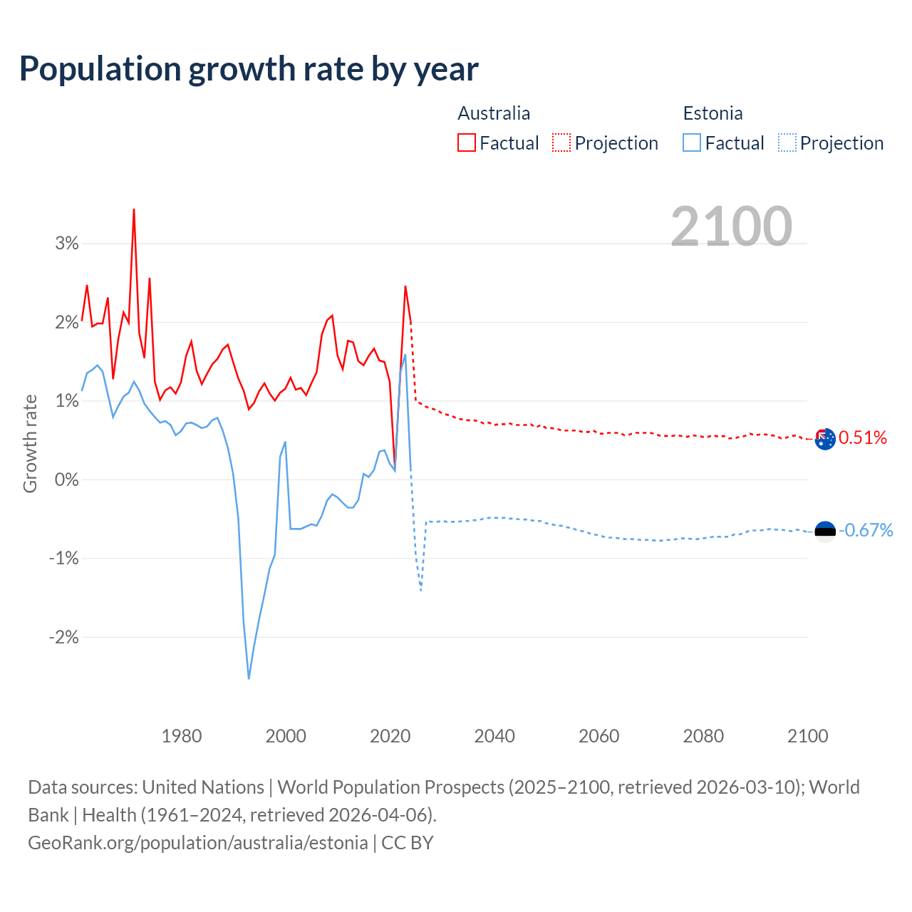- For the last 10 years, Australia has had an average growth rate of +1.49% per year vs +0.37% in Estonia.