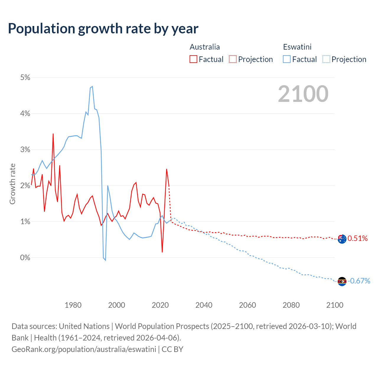 - For the last 10 years, Australia has had an average growth rate of +1.49% per year vs +0.87% in Eswatini.