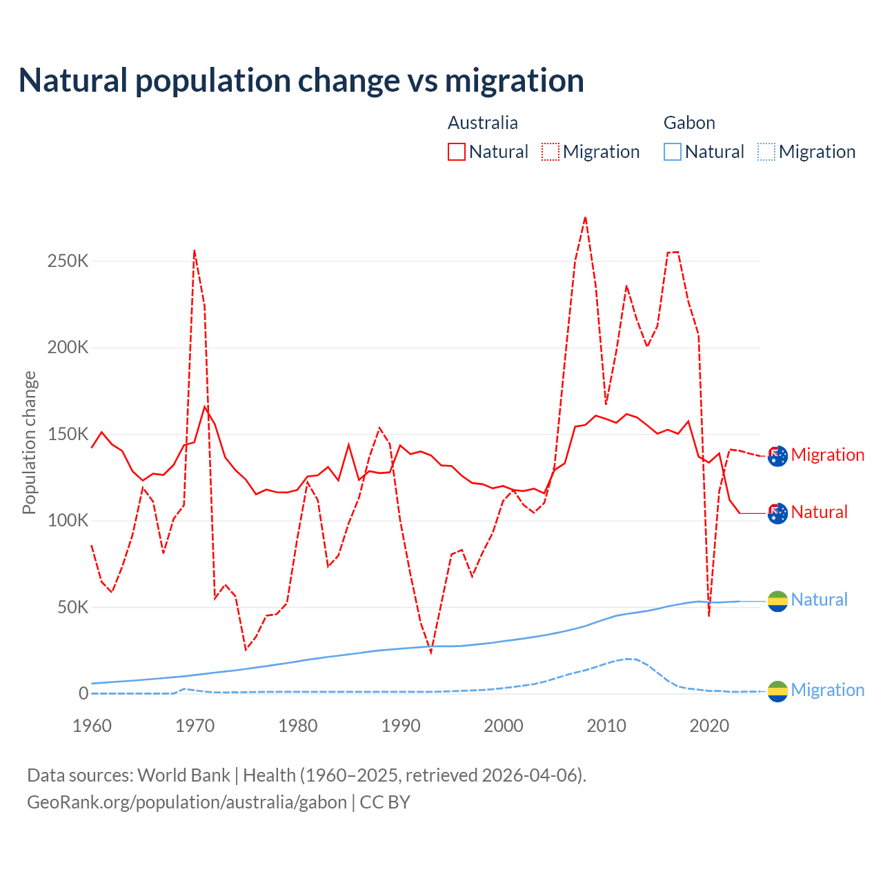 Over the last 10 years, 43.6% of the population change in Australia is from natural causes (a gain of 1,389,408 people) and 56.4% is from migration (a gain of 1,798,171 people). In Gabon 91.1% is from natural causes (a gain of 515,484 people) and 8.86% is from migration (a gain of 50,119 people).