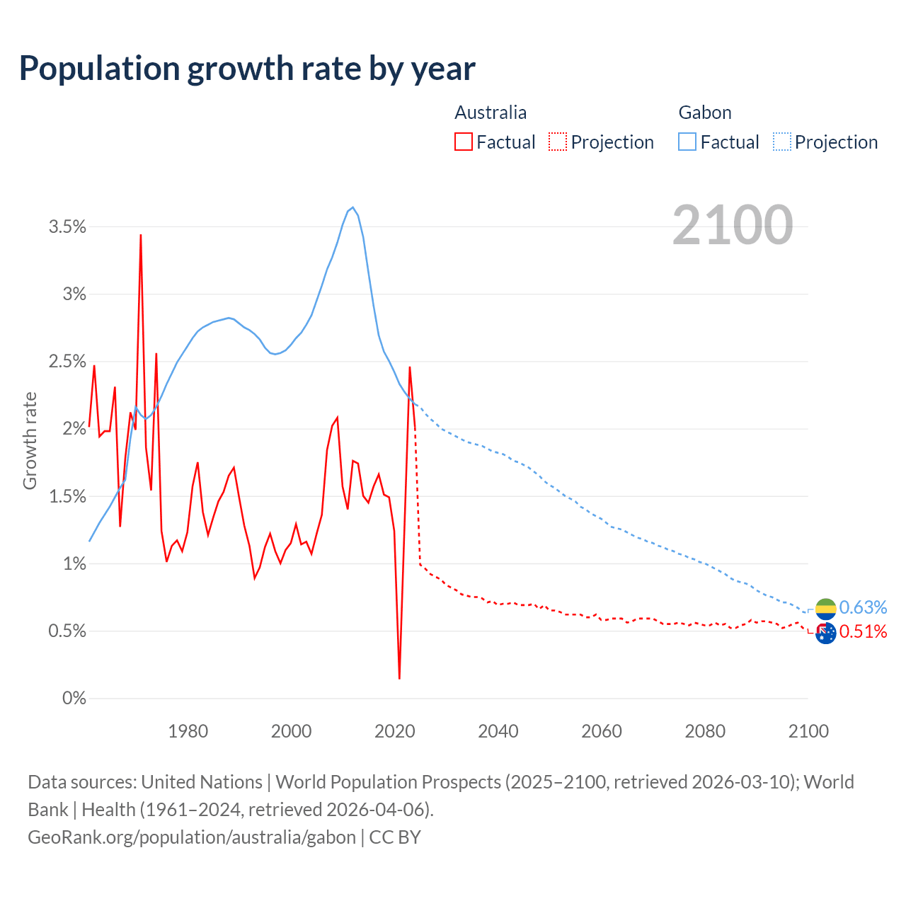 - For the last 10 years, Australia has had an average growth rate of +1.49% per year vs +2.61% in Gabon.