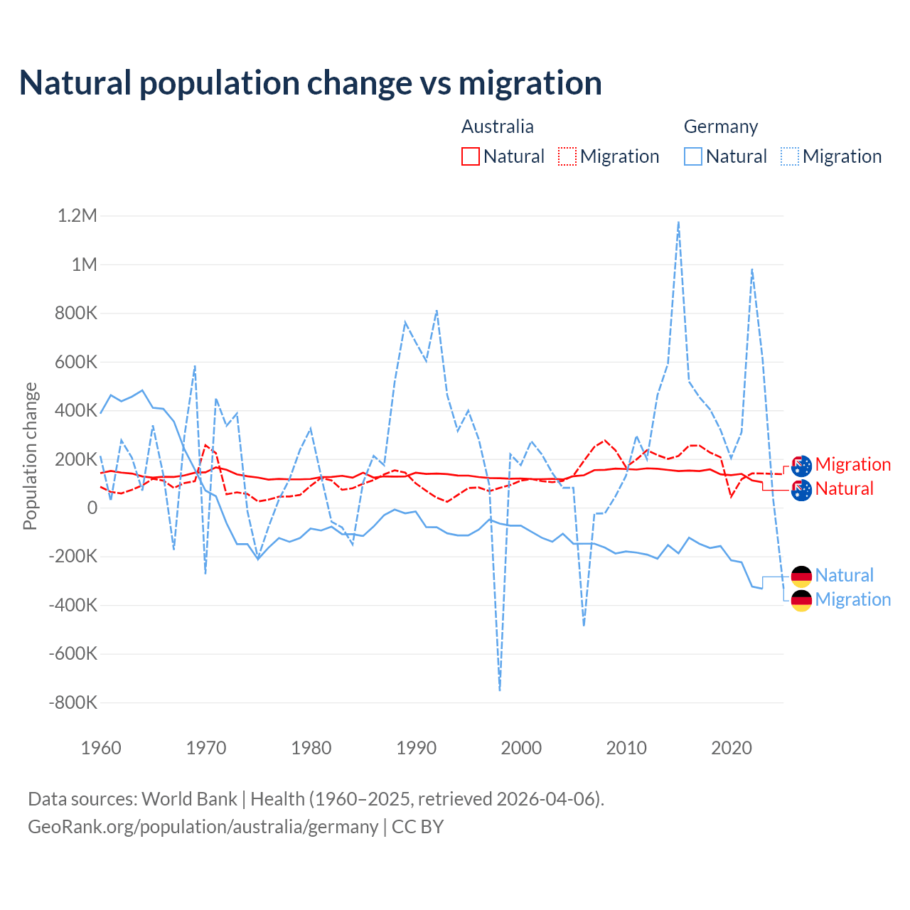 Over the last 10 years, 43.6% of the population change in Australia is from natural causes (a gain of 1,389,408 people) and 56.4% is from migration (a gain of 1,798,171 people). In Germany 26.8% is from natural causes (a loss of 2,036,130 people) and 73.2% is from migration (a gain of 5,565,916 people).