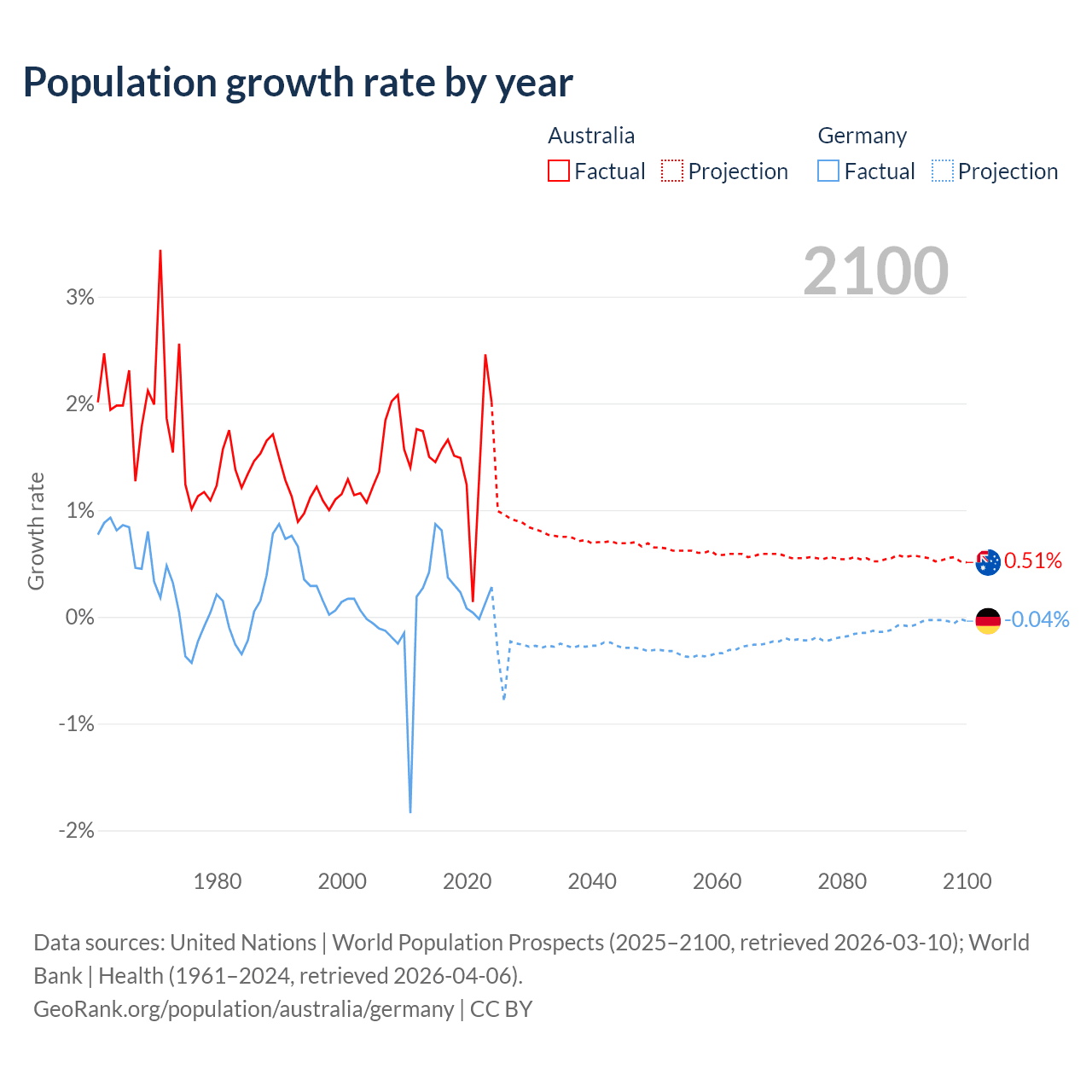 Australia vs Germany: population by year and forecast