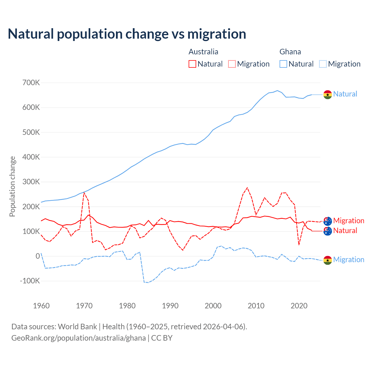 Over the last 10 years, 43.6% of the population change in Australia is from natural causes (a gain of 1,389,408 people) and 56.4% is from migration (a gain of 1,798,171 people). In Ghana 98.6% is from natural causes (a gain of 6,484,449 people) and 1.37% is from migration (a loss of 90,310 people).