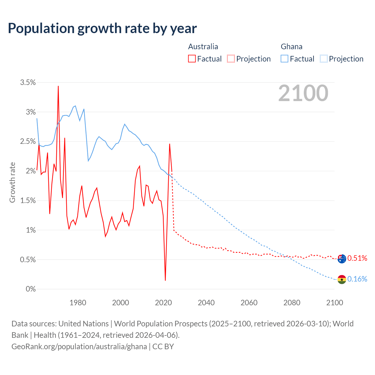 - For the last 10 years, Australia has had an average growth rate of +1.49% per year vs +2.1% in Ghana.