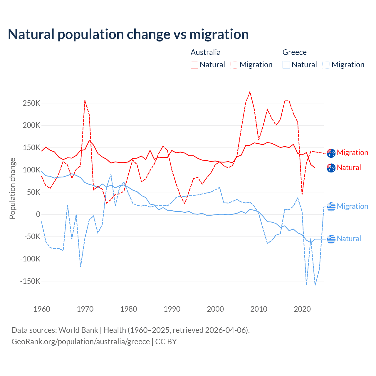 Over the last 10 years, 43.6% of the population change in Australia is from natural causes (a gain of 1,389,408 people) and 56.4% is from migration (a gain of 1,798,171 people). In Greece 51.9% is from natural causes (a loss of 411,426 people) and 48.1% is from migration (a loss of 381,824 people).