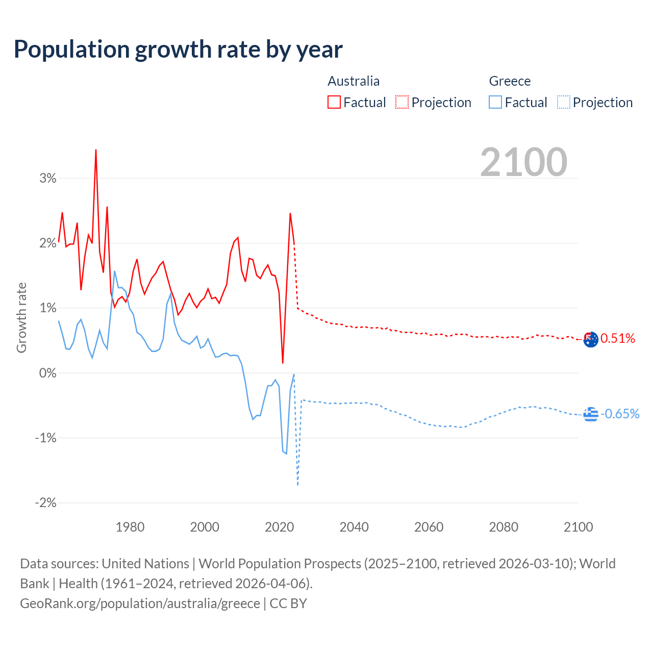 Data sources: World Bank | Health (1960–2024, retrieved 2026-04-06); United Nations | World Population Prospects (1960–2026, retrieved 2026-03-10); U.S. Census Bureau (1960–2025, retrieved 2026-02-08); Central Intelligence Agency (CIA) (2000–2019, retrieved 2026-02-20).