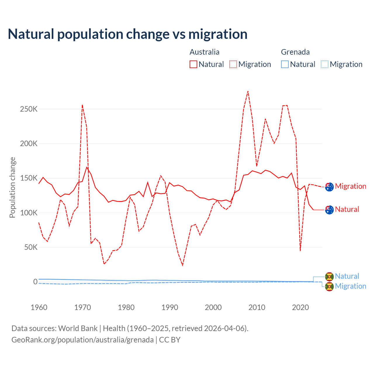 Over the last 10 years, 43.6% of the population change in Australia is from natural causes (a gain of 1,389,408 people) and 56.4% is from migration (a gain of 1,798,171 people). In Grenada 76% is from natural causes (a gain of 4,850 people) and 24% is from migration (a loss of 1,535 people).
