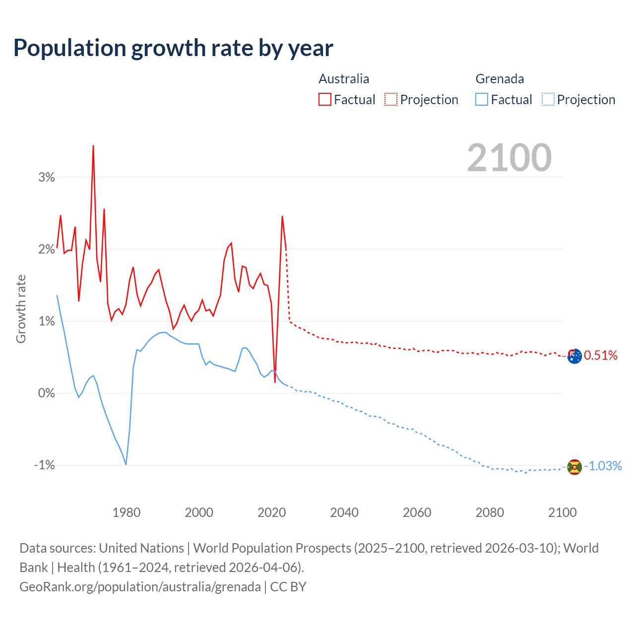 - For the last 10 years, Australia has had an average growth rate of +1.49% per year vs +0.29% in Grenada.
