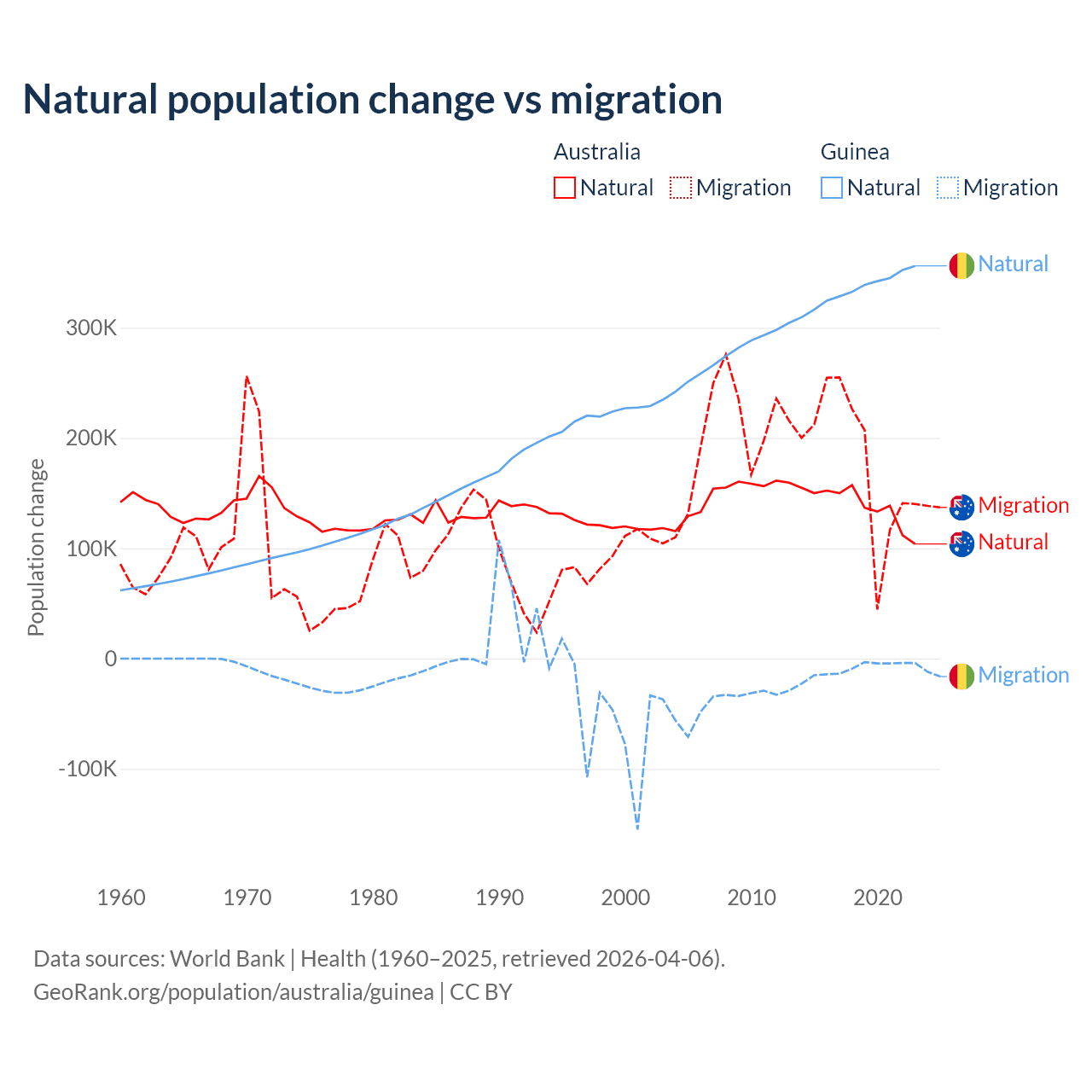 Over the last 10 years, 43.6% of the population change in Australia is from natural causes (a gain of 1,389,408 people) and 56.4% is from migration (a gain of 1,798,171 people). In Guinea 97.2% is from natural causes (a gain of 3,346,936 people) and 2.76% is from migration (a loss of 94,924 people).
