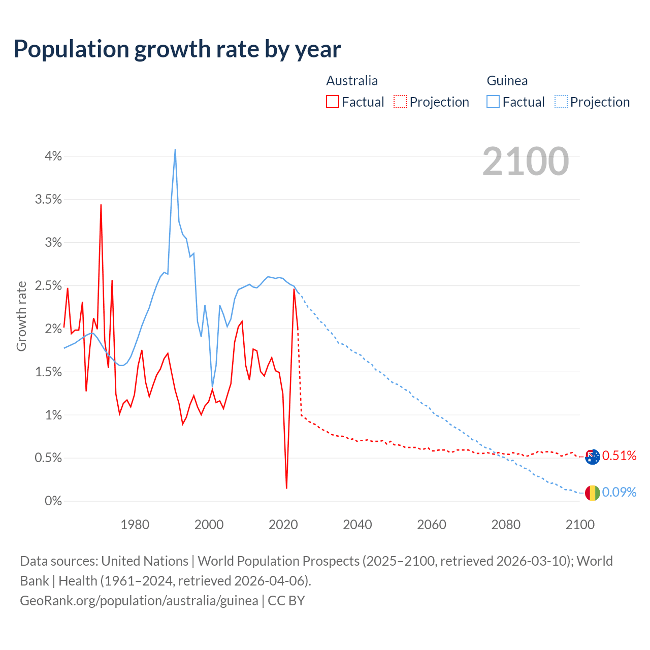- For the last 10 years, Australia has had an average growth rate of +1.49% per year vs +2.54% in Guinea.