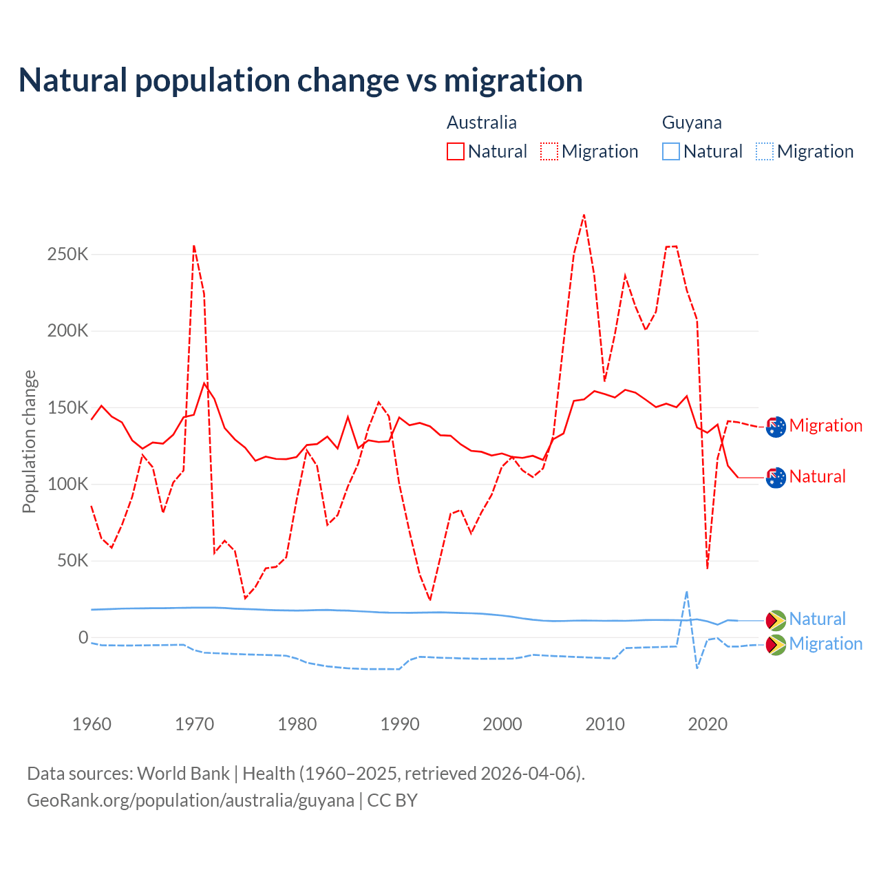 Over the last 10 years, 43.6% of the population change in Australia is from natural causes (a gain of 1,389,408 people) and 56.4% is from migration (a gain of 1,798,171 people). In Guyana 77.7% is from natural causes (a gain of 107,419 people) and 22.3% is from migration (a loss of 30,797 people).