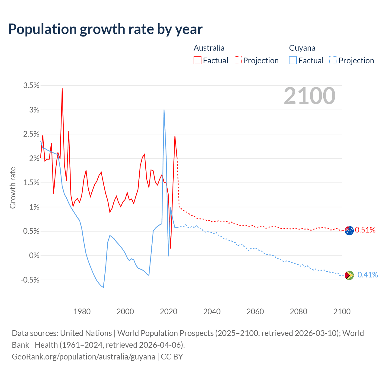 - For the last 10 years, Australia has had an average growth rate of +1.49% per year vs +0.94% in Guyana.