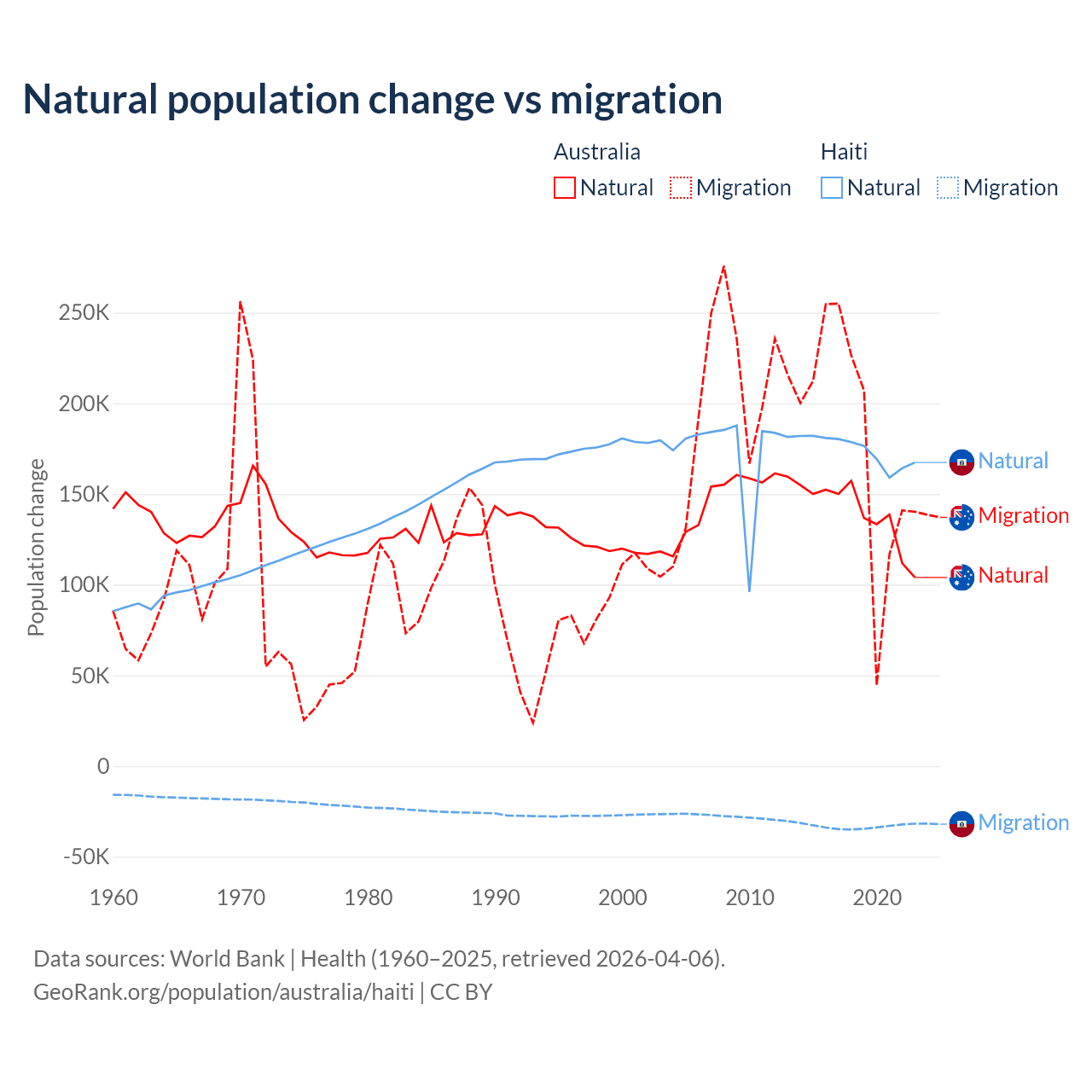 Over the last 10 years, 43.6% of the population change in Australia is from natural causes (a gain of 1,389,408 people) and 56.4% is from migration (a gain of 1,798,171 people). In Haiti 83.9% is from natural causes (a gain of 1,740,319 people) and 16.1% is from migration (a loss of 333,076 people).