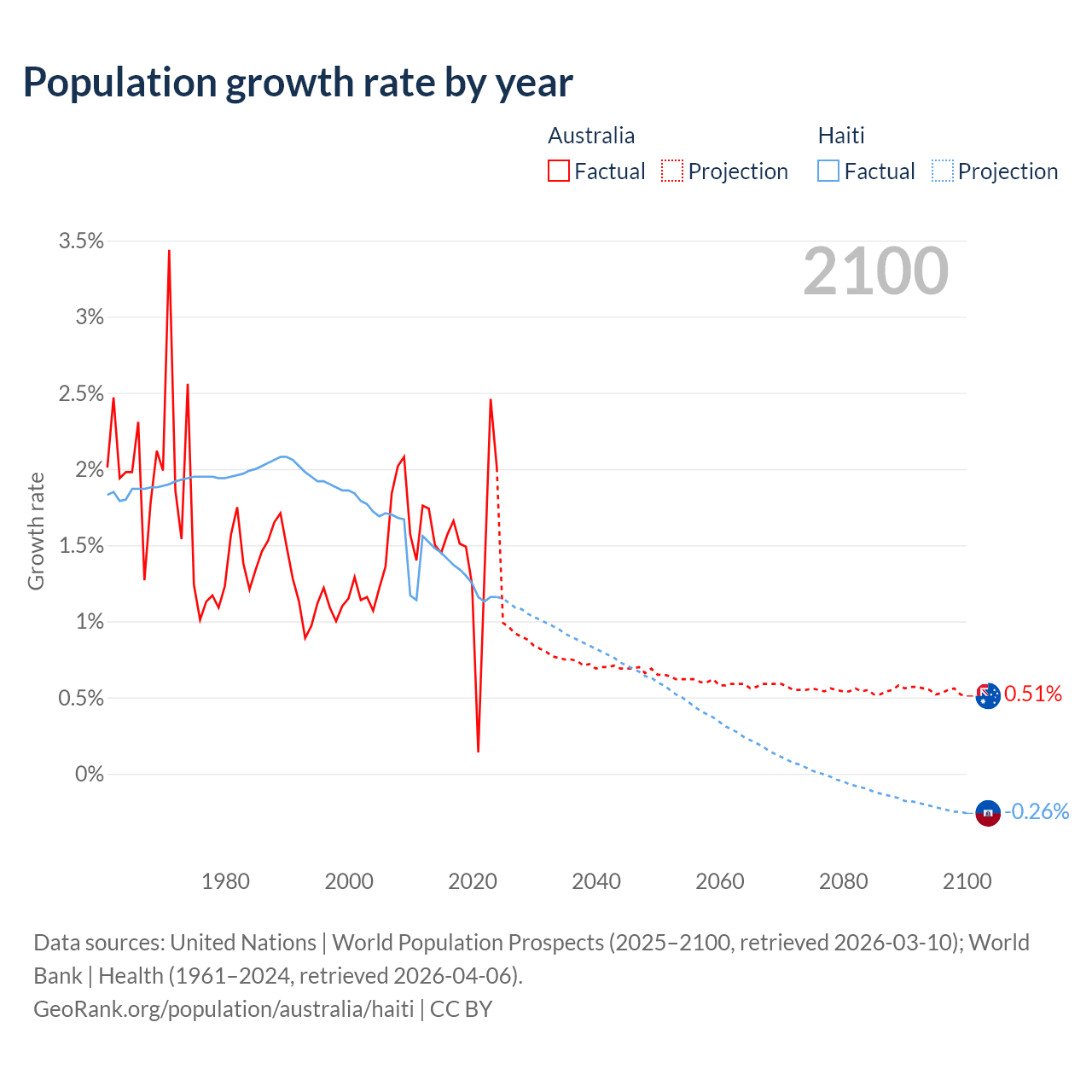 - For the last 10 years, Australia has had an average growth rate of +1.49% per year vs +1.29% in Haiti.