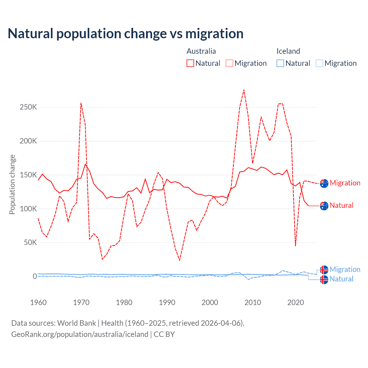 Over the last 10 years, 43.6% of the population change in Australia is from natural causes (a gain of 1,389,408 people) and 56.4% is from migration (a gain of 1,798,171 people). In Iceland 30.7% is from natural causes (a gain of 20,128 people) and 69.3% is from migration (a gain of 45,356 people).