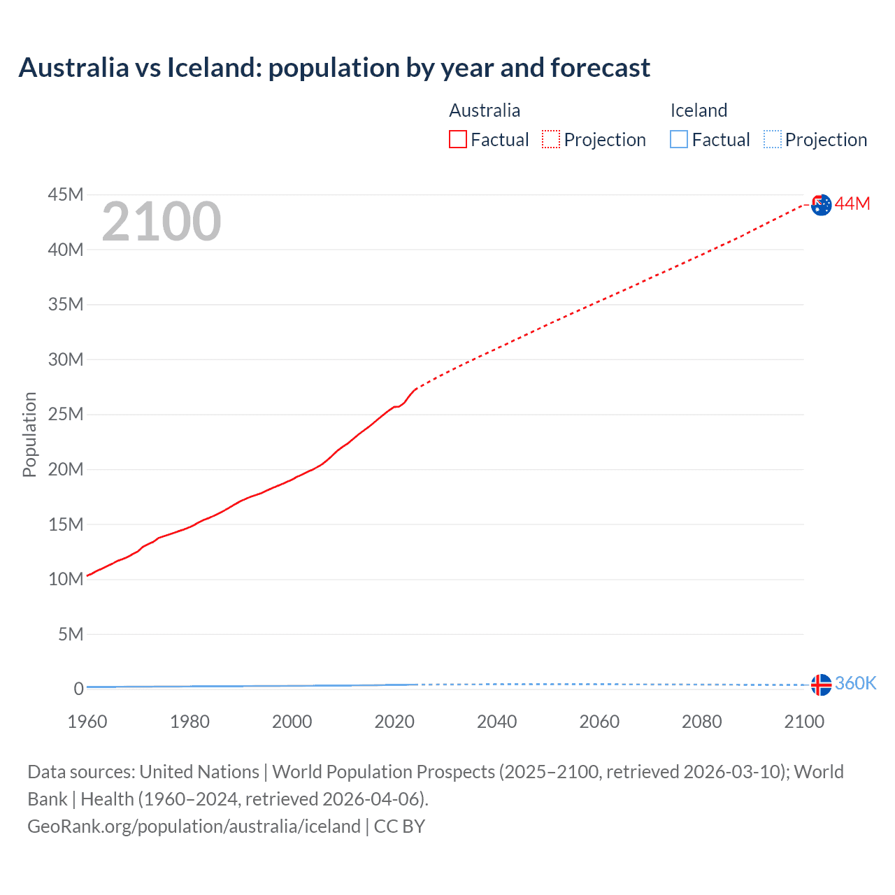 Australia vs Iceland: population by year and forecast