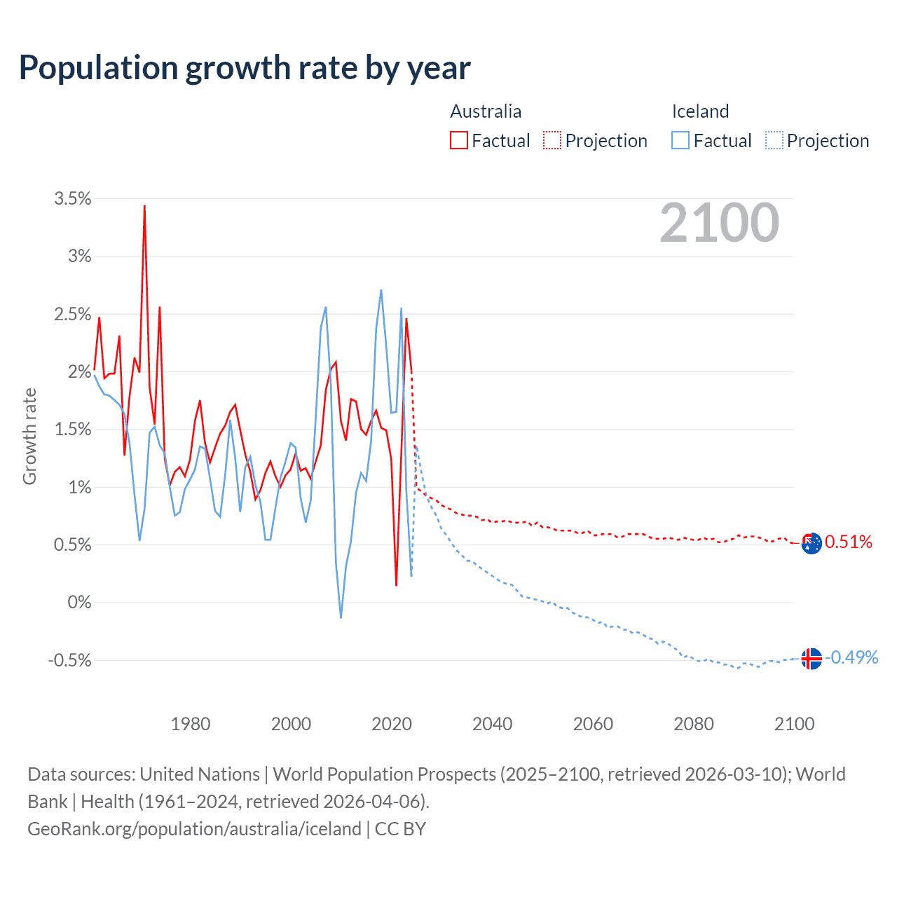 - For the last 10 years, Australia has had an average growth rate of +1.49% per year vs +1.63% in Iceland.