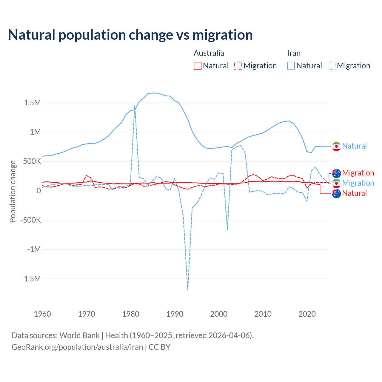 Over the last 10 years, 43.6% of the population change in Australia is from natural causes (a gain of 1,389,408 people) and 56.4% is from migration (a gain of 1,798,171 people). In Iran 92.5% is from natural causes (a gain of 9,405,860 people) and 7.46% is from migration (a gain of 757,979 people).