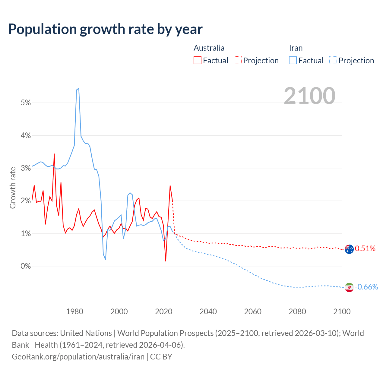 - For the last 10 years, Australia has had an average growth rate of +1.49% per year vs +1.19% in Iran.