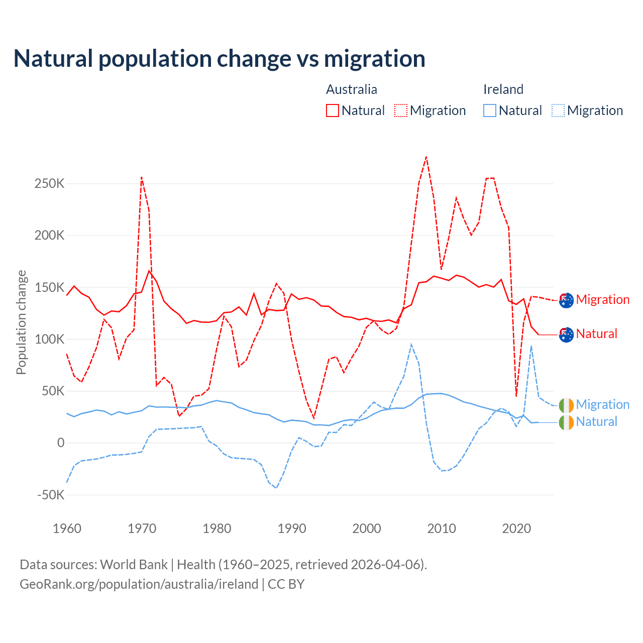 Over the last 10 years, 43.6% of the population change in Australia is from natural causes (a gain of 1,389,408 people) and 56.4% is from migration (a gain of 1,798,171 people). In Ireland 48.2% is from natural causes (a gain of 284,644 people) and 51.8% is from migration (a gain of 305,297 people).