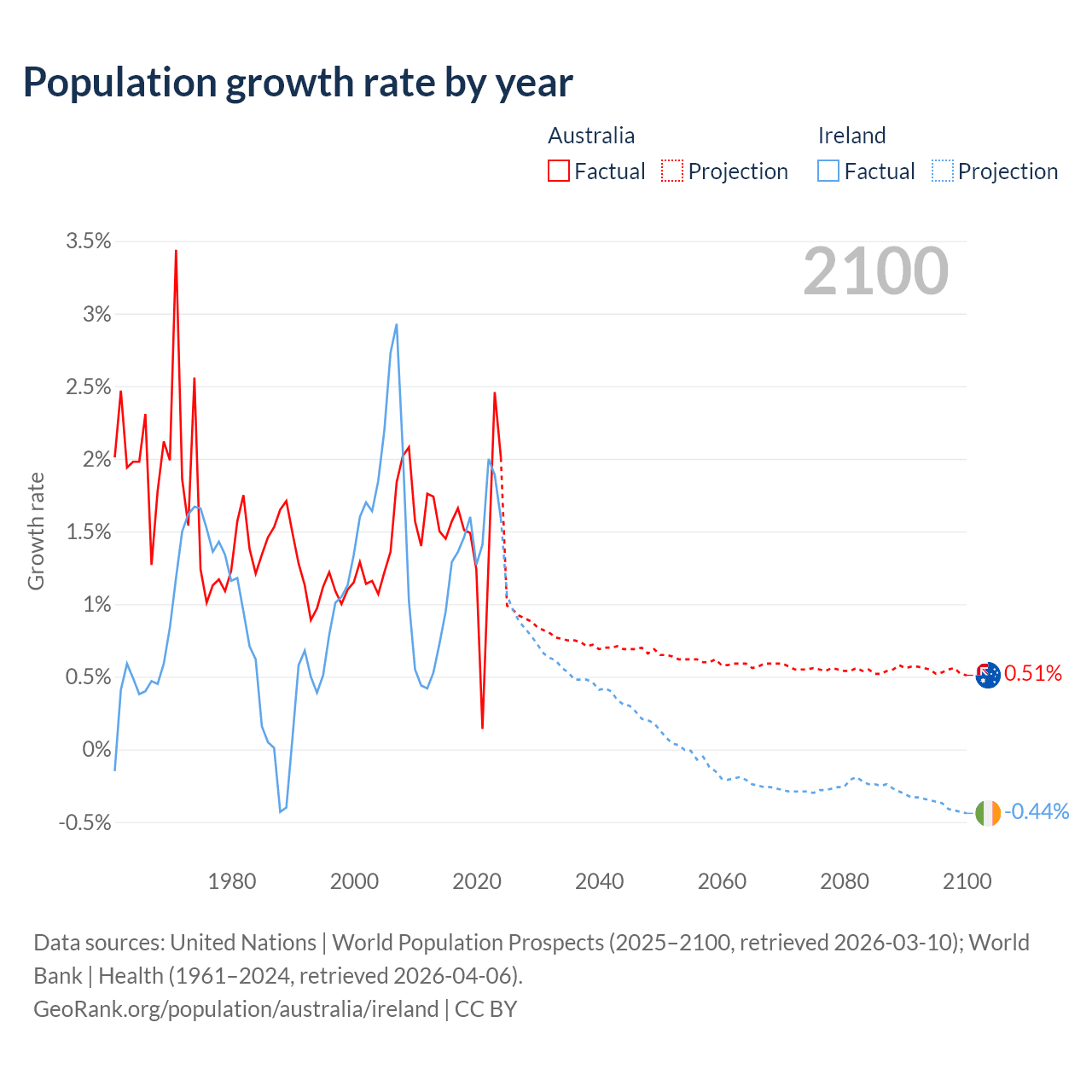 - For the last 10 years, Australia has had an average growth rate of +1.49% per year vs +1.41% in Ireland.