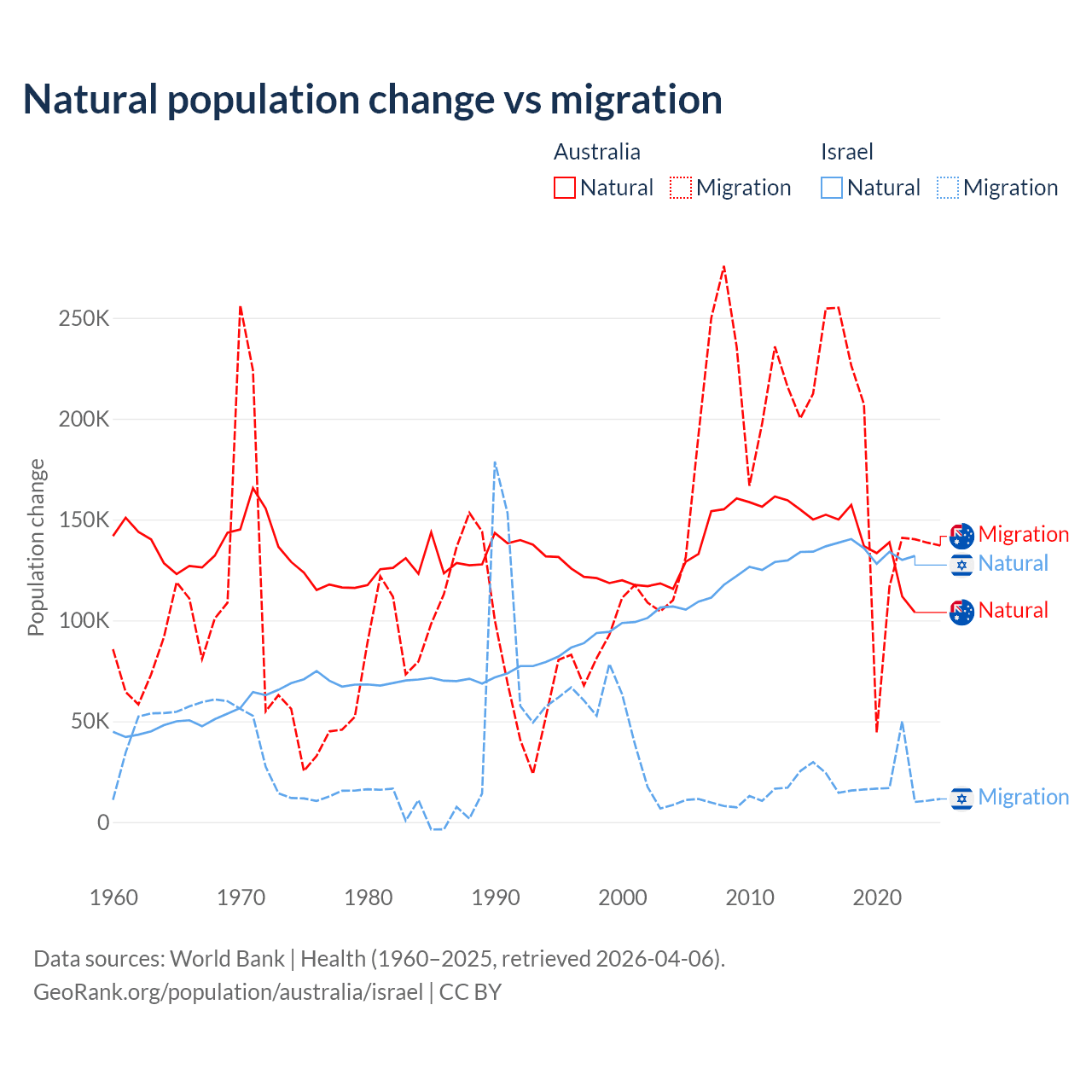 Over the last 10 years, 43.6% of the population change in Australia is from natural causes (a gain of 1,389,408 people) and 56.4% is from migration (a gain of 1,798,171 people). In Israel 86% is from natural causes (a gain of 1,343,492 people) and 14% is from migration (a gain of 219,048 people).