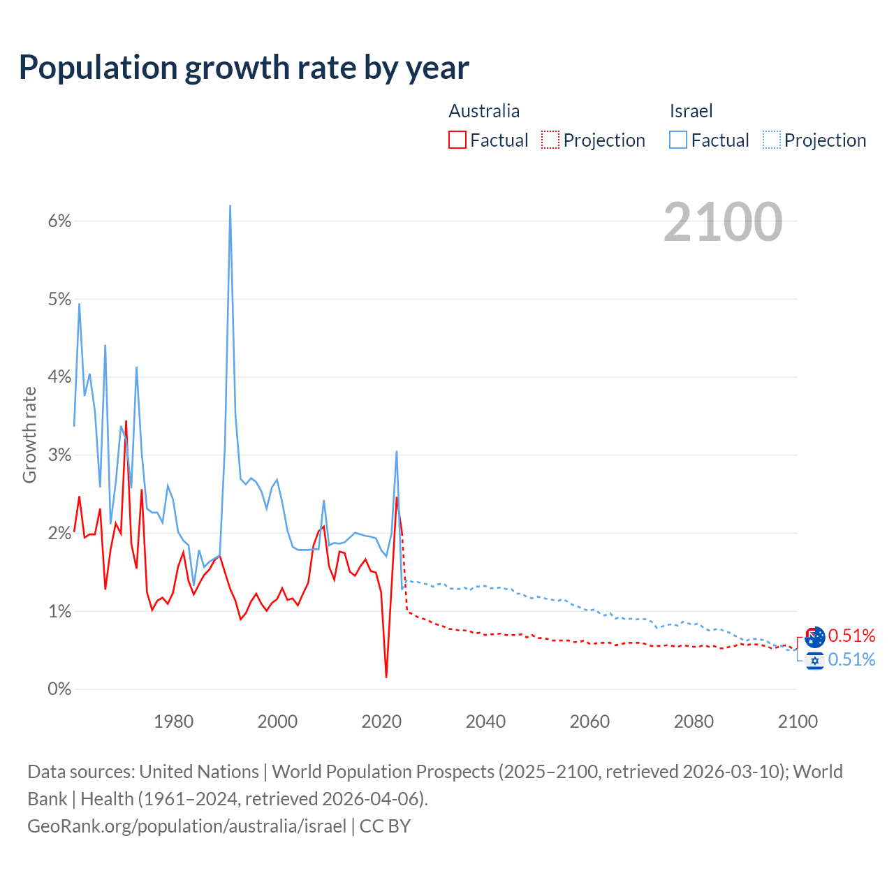 - For the last 10 years, Australia has had an average growth rate of +1.49% per year vs +1.96% in Israel.