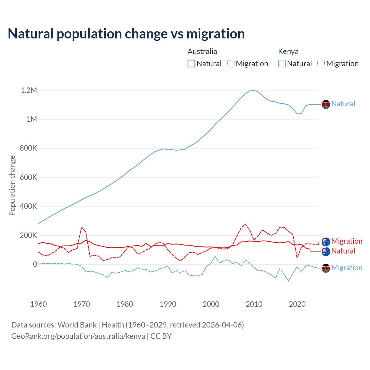 Over the last 10 years, 43.6% of the population change in Australia is from natural causes (a gain of 1,389,408 people) and 56.4% is from migration (a gain of 1,798,171 people). In Kenya 95.3% is from natural causes (a gain of 10,892,362 people) and 4.67% is from migration (a loss of 533,876 people).