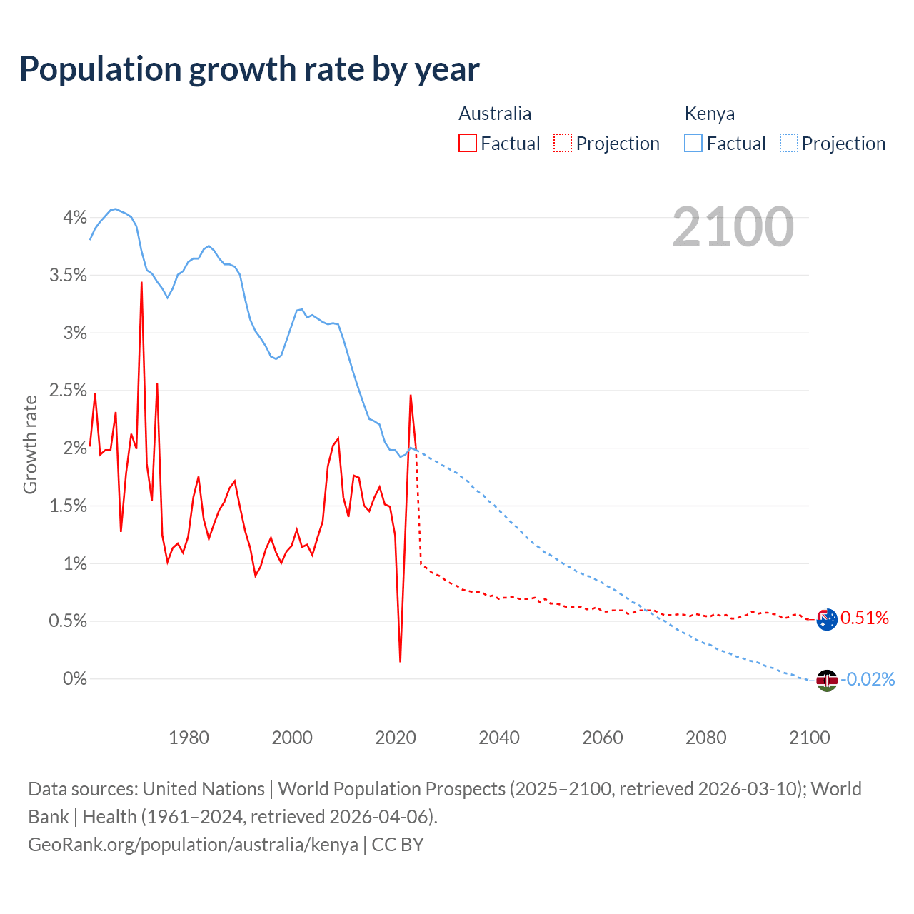 - For the last 10 years, Australia has had an average growth rate of +1.49% per year vs +2.08% in Kenya.