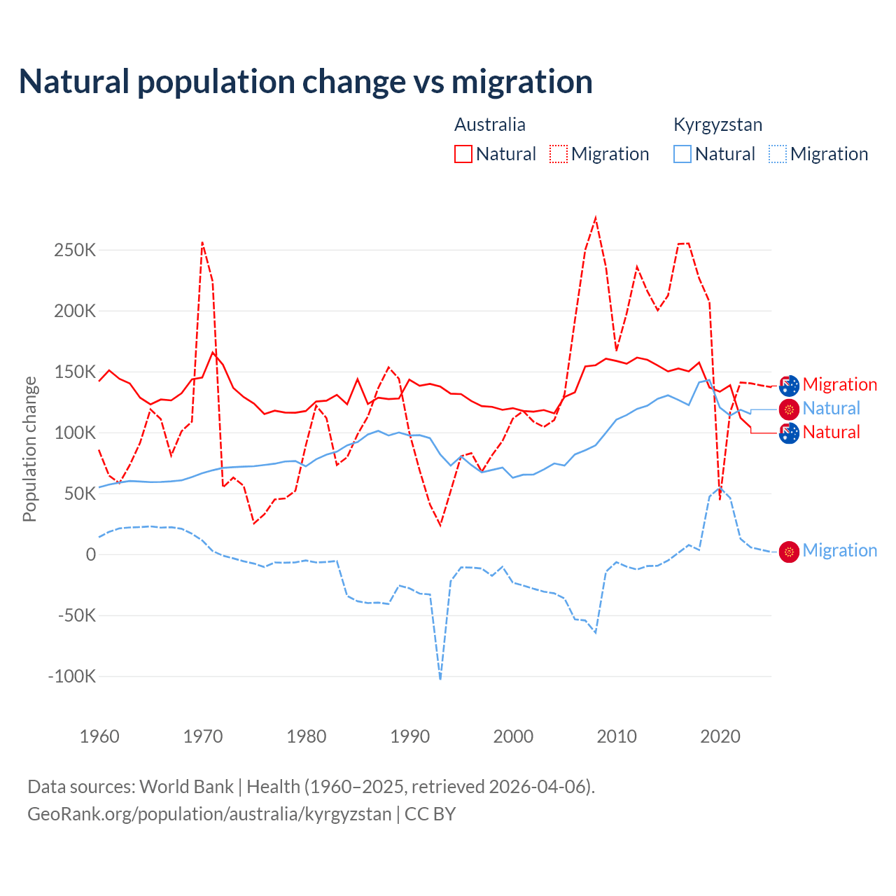 Over the last 10 years, 43.6% of the population change in Australia is from natural causes (a gain of 1,389,408 people) and 56.4% is from migration (a gain of 1,798,171 people). In Kyrgyzstan 88.5% is from natural causes (a gain of 1,258,837 people) and 11.5% is from migration (a gain of 164,132 people).