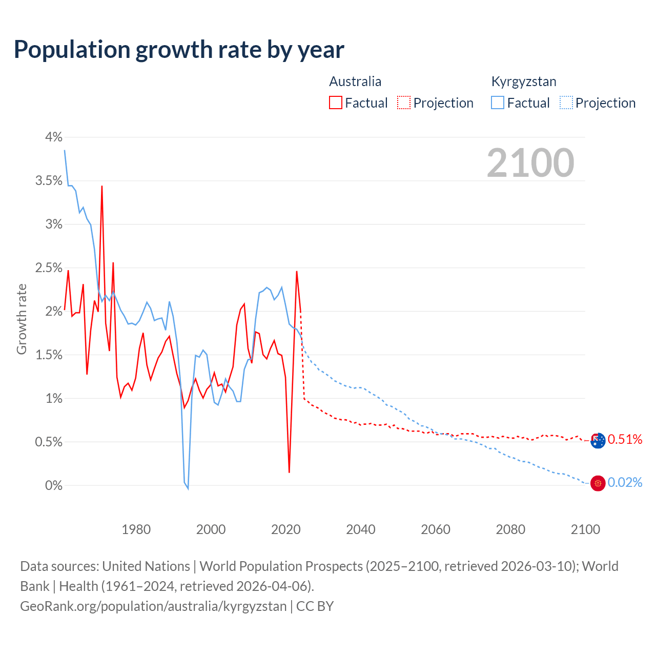 - For the last 10 years, Australia has had an average growth rate of +1.49% per year vs +2.05% in Kyrgyzstan.